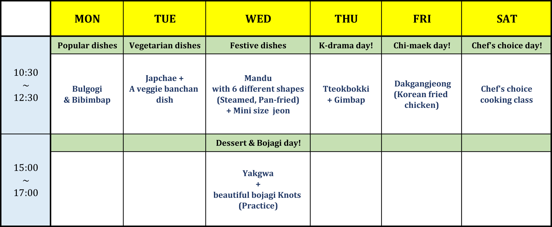 ![]() | TUESDAY (10:30am~12:30pm) _ VEGETARIAN DISHES Veggie option dishes? Sure! Japchae + A veggie banchan dish A perfect time for vegetarians or anyone who loves plant-based dishes!